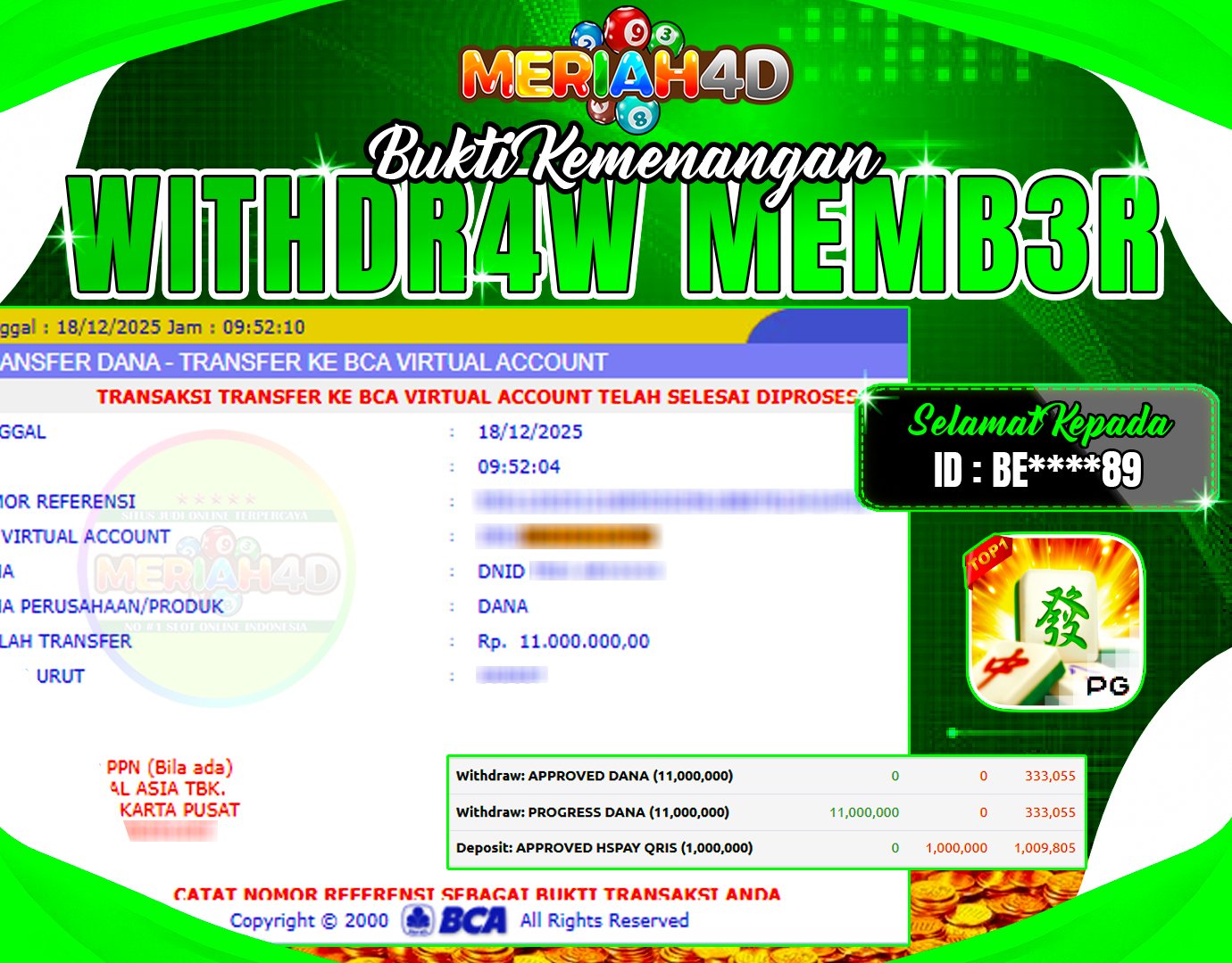 Selamat Kepada ID : BE****89 Atas Withdraw Rp. 11.000.000 Juta Hari ini. Ditunggu Withdraw Selanjutnya dan ajak juga teman temannya bergabung di Meriah4d