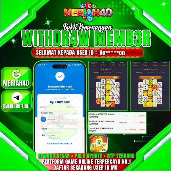Selamat Kepada ID : VE******ON Atas Withdraw Rp. 7.000.000 Juta Hari ini. Ditunggu Withdraw Selanjutnya dan ajak juga teman temannya bergabung di Meriah4d