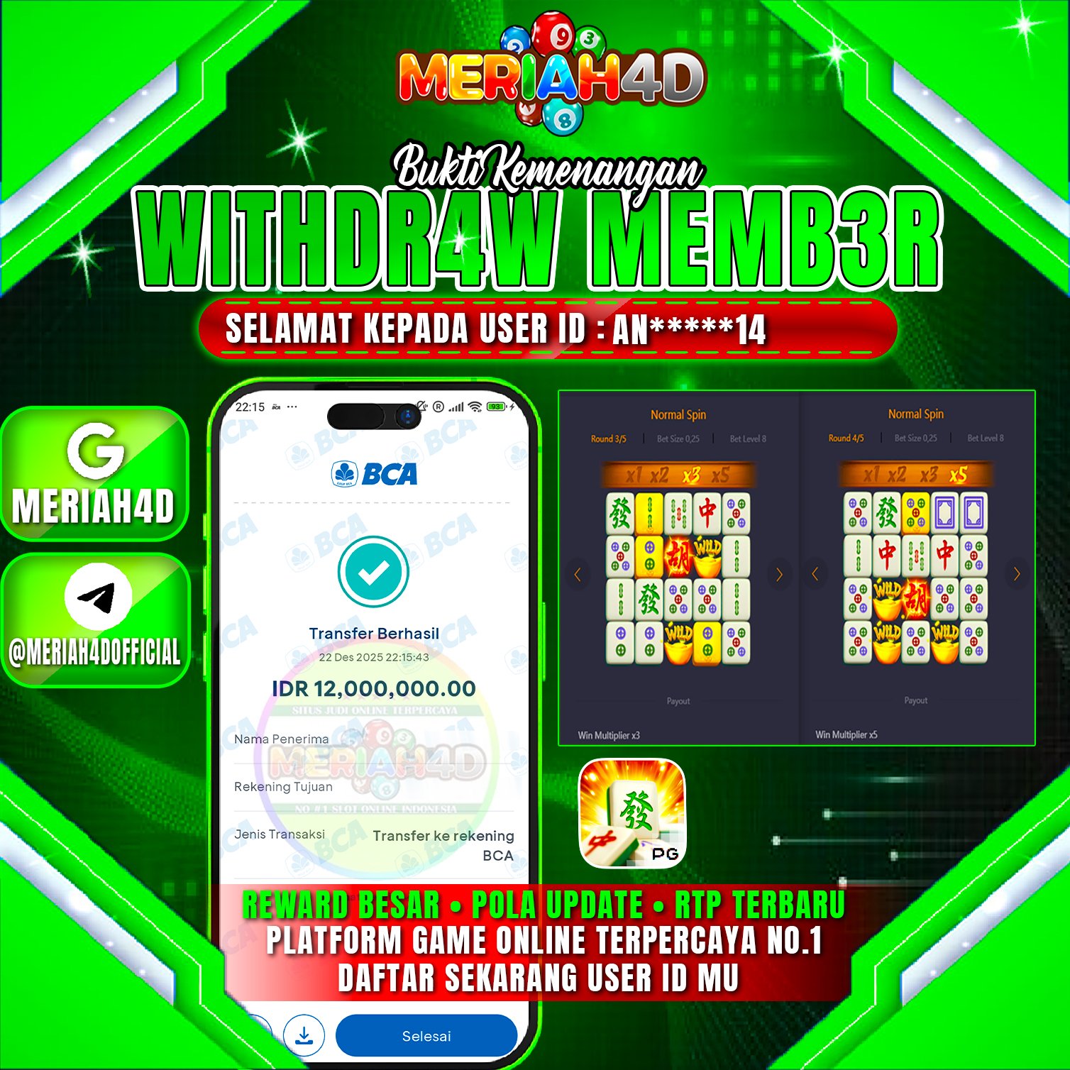 Selamat Kepada ID : AN******14 Atas Withdraw Rp. 12.000.000 Juta Hari ini. Ditunggu Withdraw Selanjutnya dan ajak juga teman temannya bergabung di Meriah4d