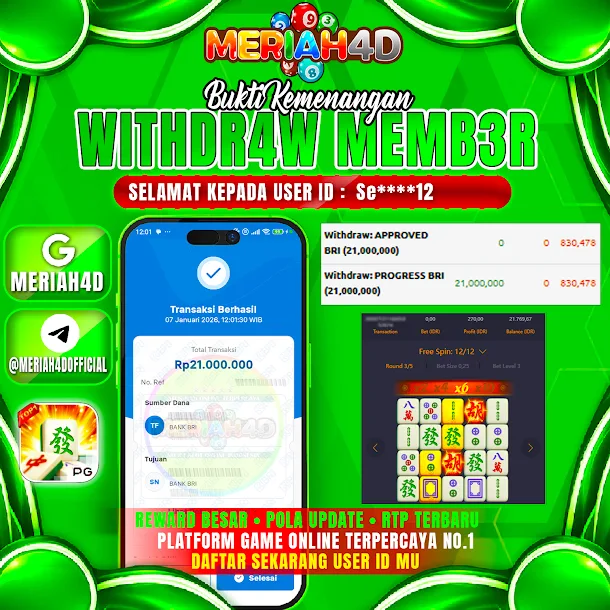 Selamat Kepada ID : SE******12 Atas Withdraw Rp. 21.000.000 Juta Hari ini. Ditunggu Withdraw Selanjutnya dan ajak juga teman temannya bergabung di Meriah4d