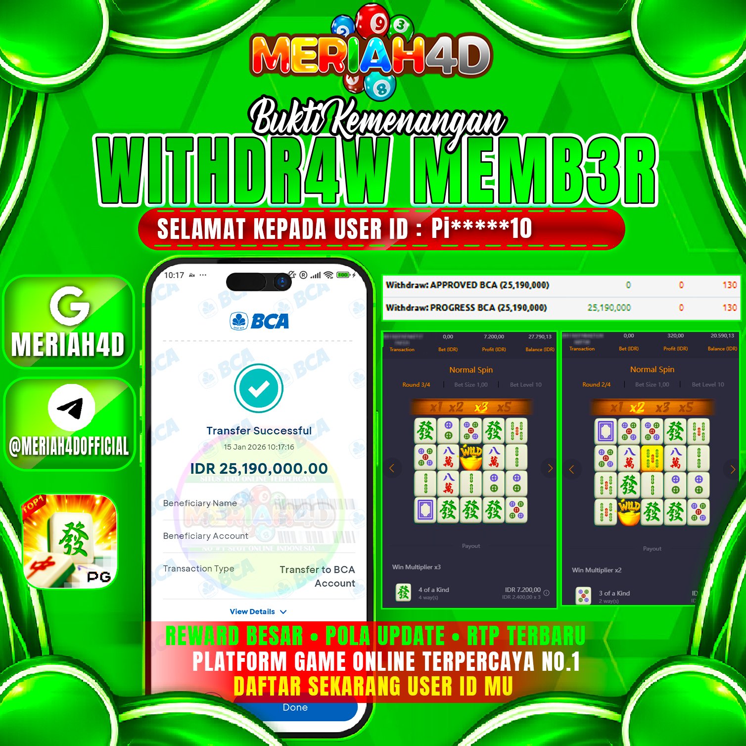 Selamat Kepada ID :PI*******10 Atas Withdraw Rp. 25.190.000 Juta Hari ini. Ditunggu Withdraw Selanjutnya dan ajak juga teman temannya bergabung di Meriah4d
