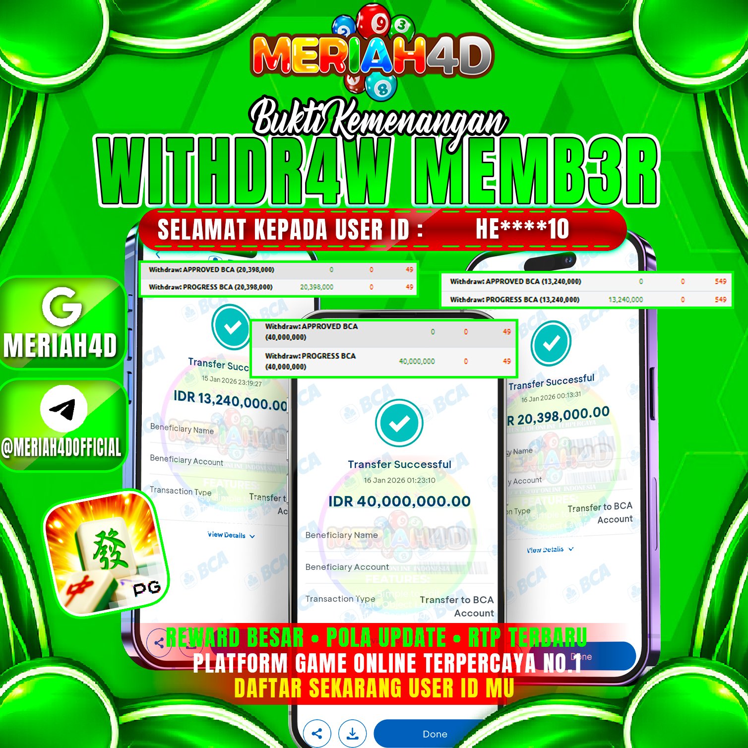 Selamat Kepada ID : HE*******10 Atas Withdraw Rp. 73.638.000 Juta Hari ini. Ditunggu Withdraw Selanjutnya dan ajak juga teman temannya bergabung di Meriah4d