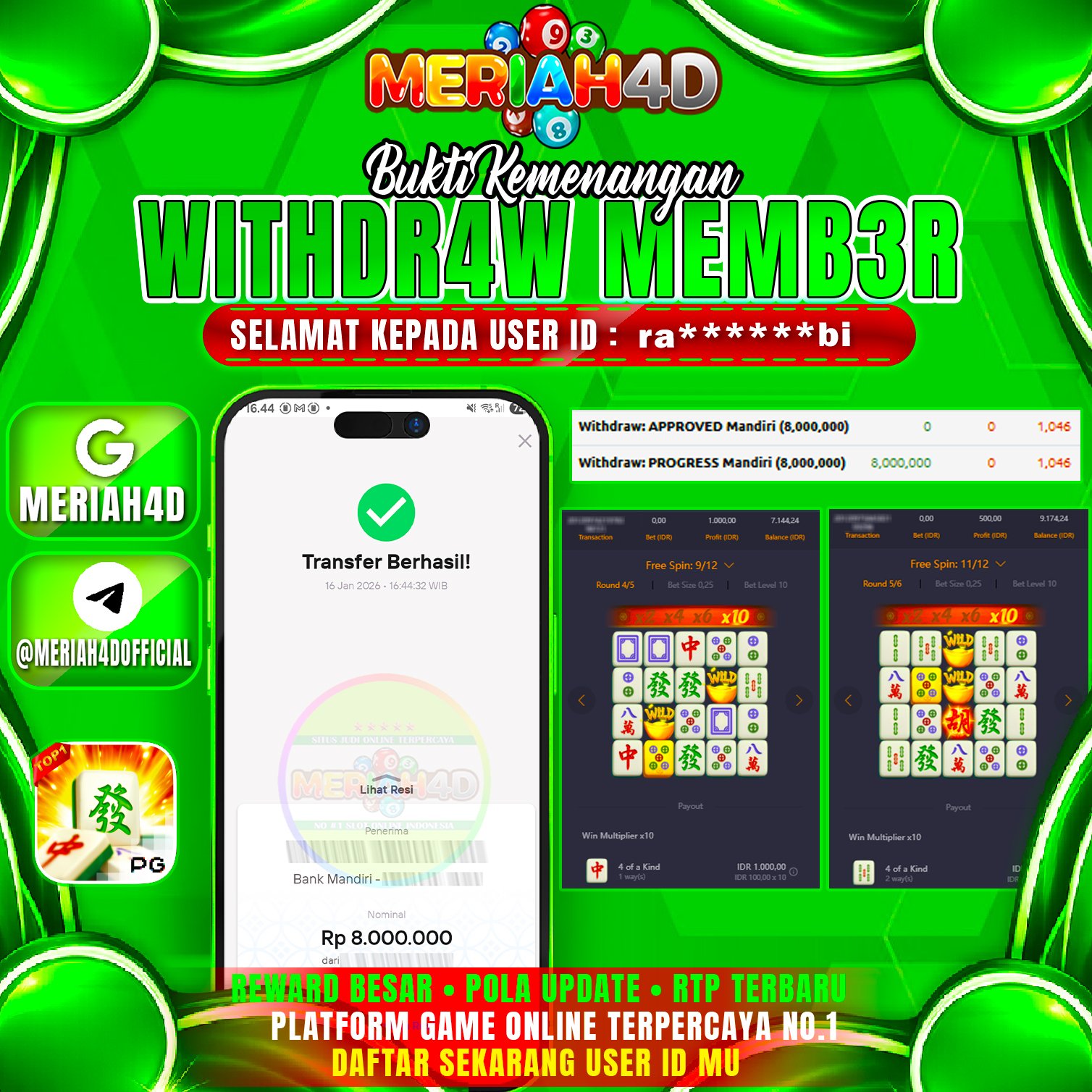 Selamat Kepada ID : ra******bi Atas Withdraw Rp. 8.000.000 Juta Hari ini. Ditunggu Withdraw Selanjutnya dan ajak juga teman temannya bergabung di Meriah4d