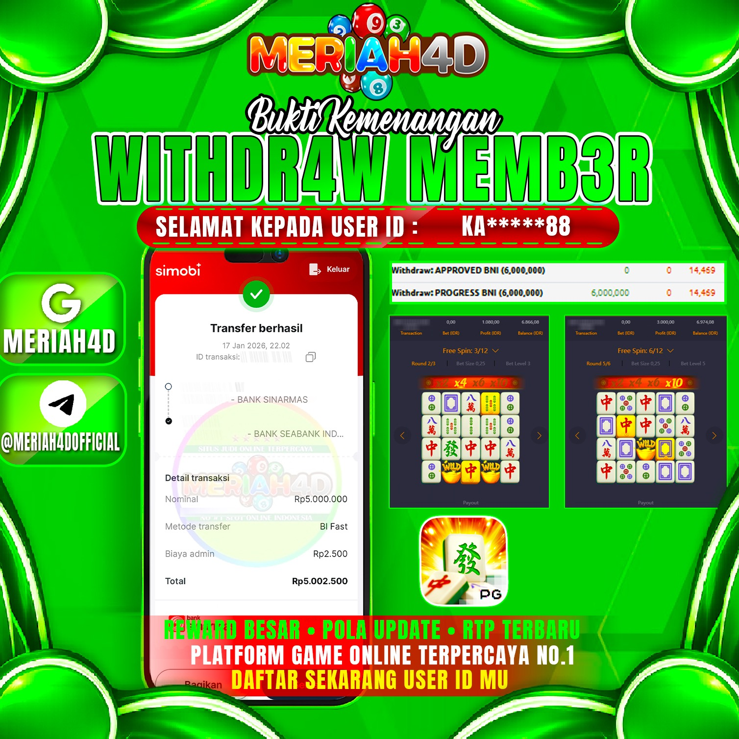 Selamat Kepada ID : KA*****88 Atas Withdraw Rp. 5.000.000 Juta Hari ini. Ditunggu Withdraw Selanjutnya dan ajak juga teman temannya bergabung di Meriah4d