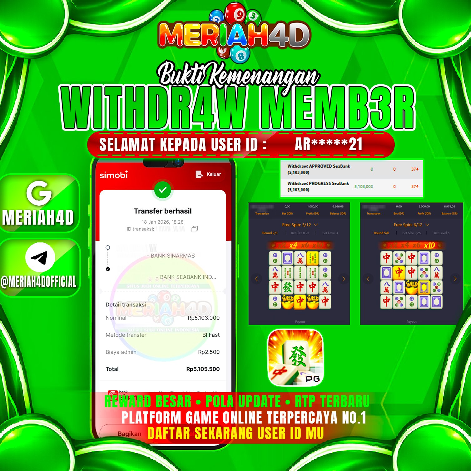 Selamat Kepada ID : HE******10 Atas Withdraw Rp. 5.103.000 Juta Hari ini. Ditunggu Withdraw Selanjutnya dan ajak juga teman temannya bergabung di Meriah4d