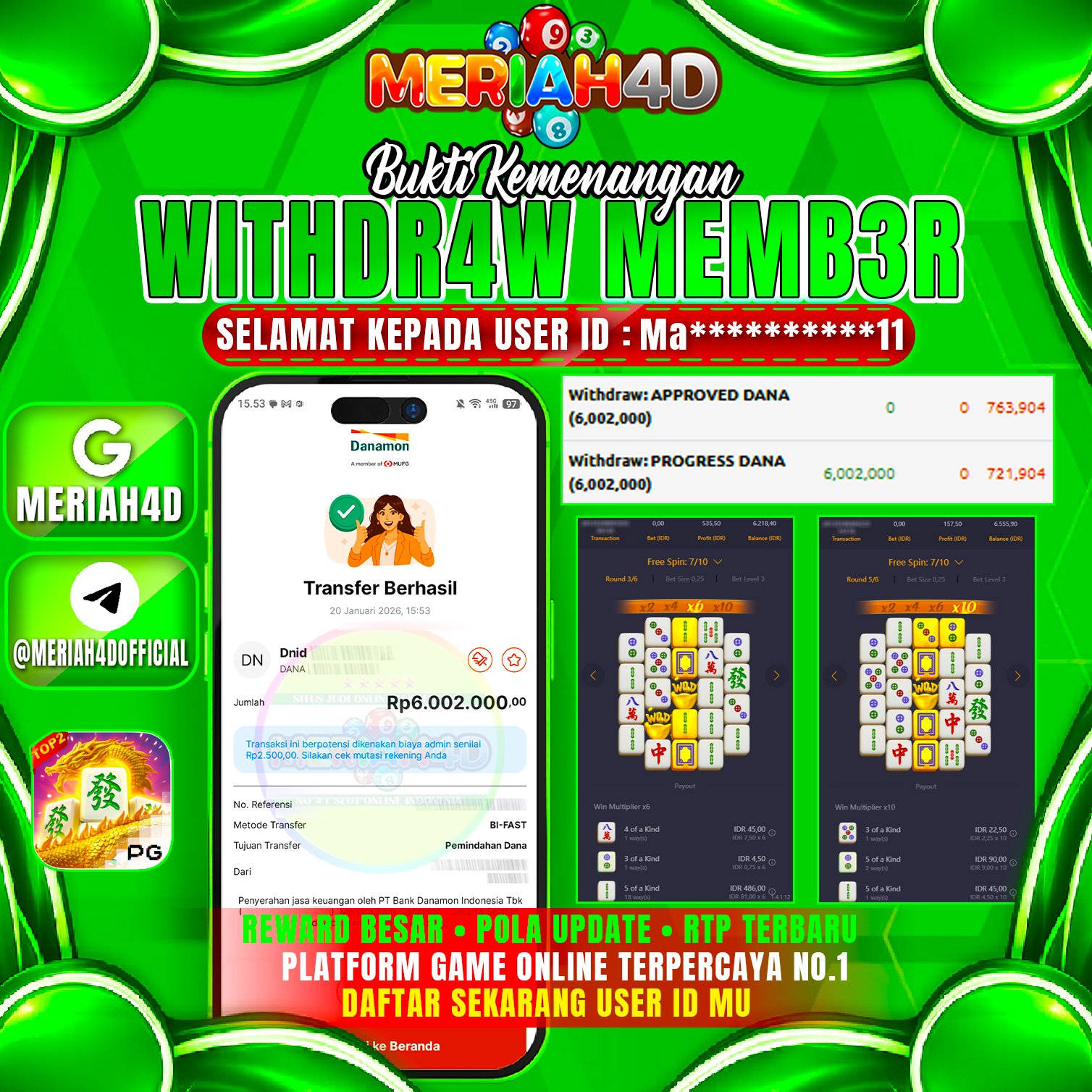 Selamat Kepada ID : MA******11 Atas Withdraw Rp. 6.000.000 Juta Hari ini. Ditunggu Withdraw Selanjutnya dan ajak juga teman temannya bergabung di Meriah4d