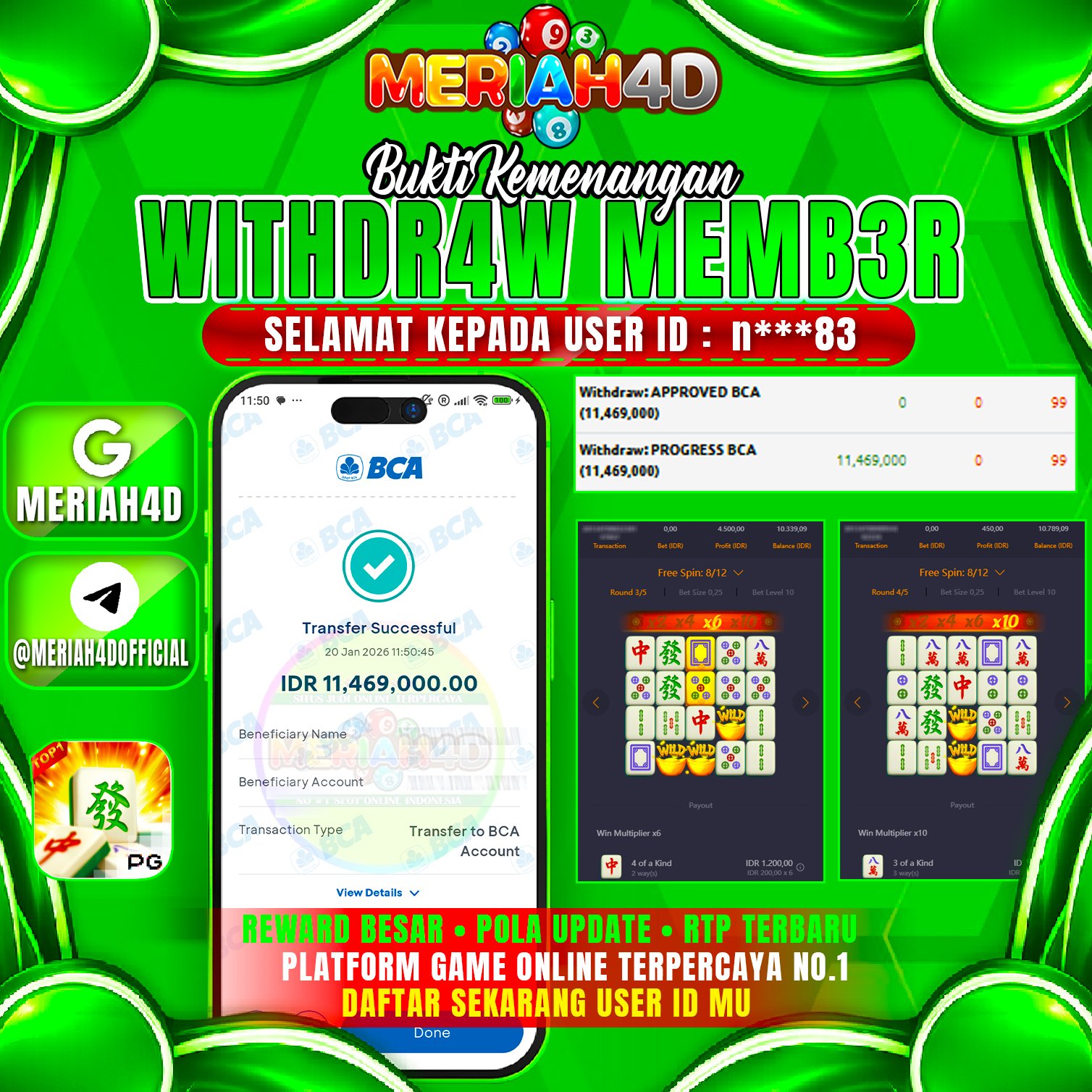 Selamat Kepada ID : N******83 Atas Withdraw Rp. 11.469.000 Juta Hari ini. Ditunggu Withdraw Selanjutnya dan ajak juga teman temannya bergabung di Meriah4d