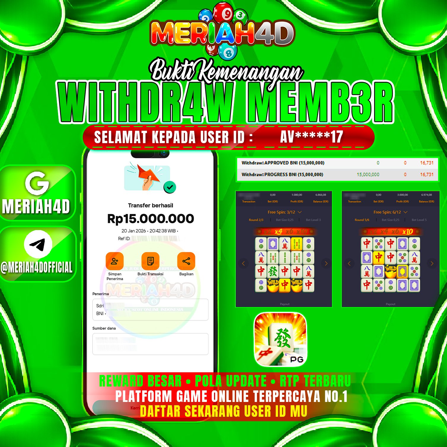 Selamat Kepada ID : AV******17 Atas Withdraw Rp. 15.000.000 Juta Hari ini. Ditunggu Withdraw Selanjutnya dan ajak juga teman temannya bergabung di Meriah4d