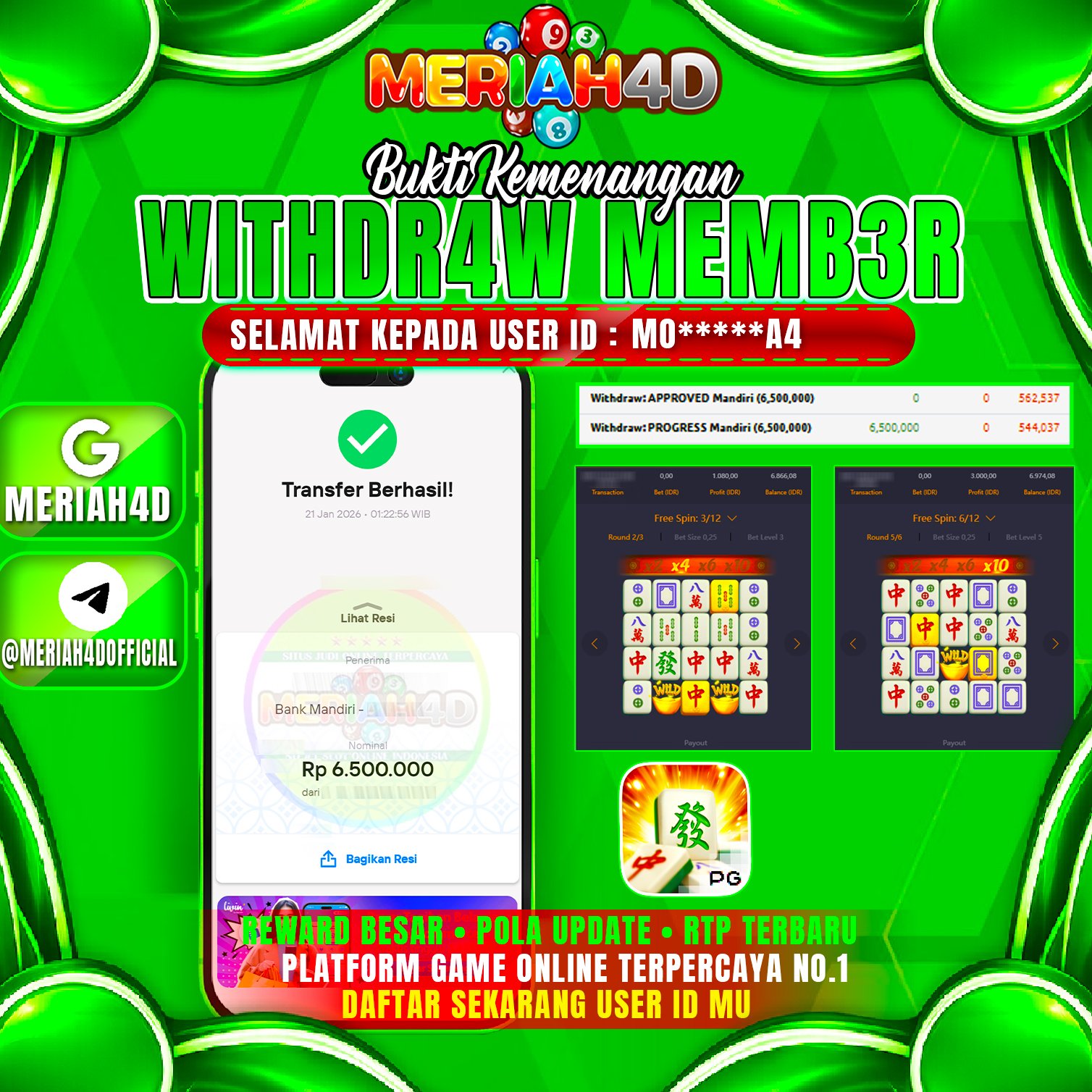 Selamat Kepada ID : MO******A4 Atas Withdraw Rp. 6.500.000 Juta Hari ini. Ditunggu Withdraw Selanjutnya dan ajak juga teman temannya bergabung di Meriah4d
