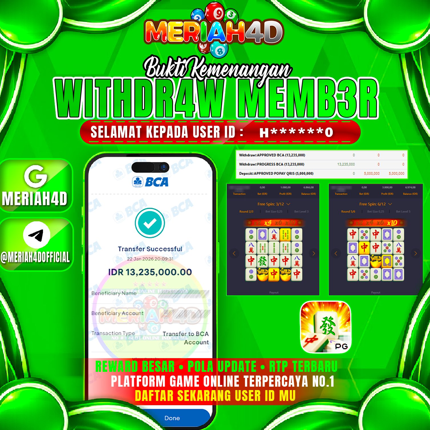 Selamat Kepada ID : H******0 Atas Withdraw Rp. 13.235.000 Juta Hari ini. Ditunggu Withdraw Selanjutnya dan ajak juga teman temannya bergabung di Meriah4d