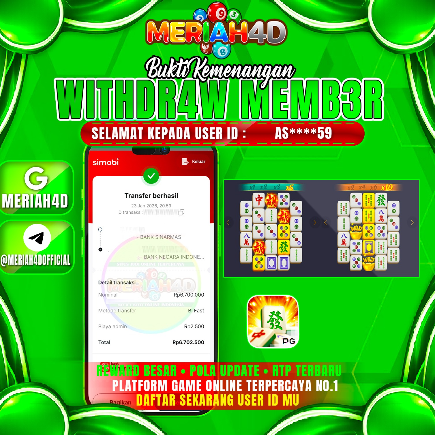 Selamat Kepada ID : AS******59 Atas Withdraw Rp. 6.700.000 Juta Hari ini. Ditunggu Withdraw Selanjutnya dan ajak juga teman temannya bergabung di Meriah4d