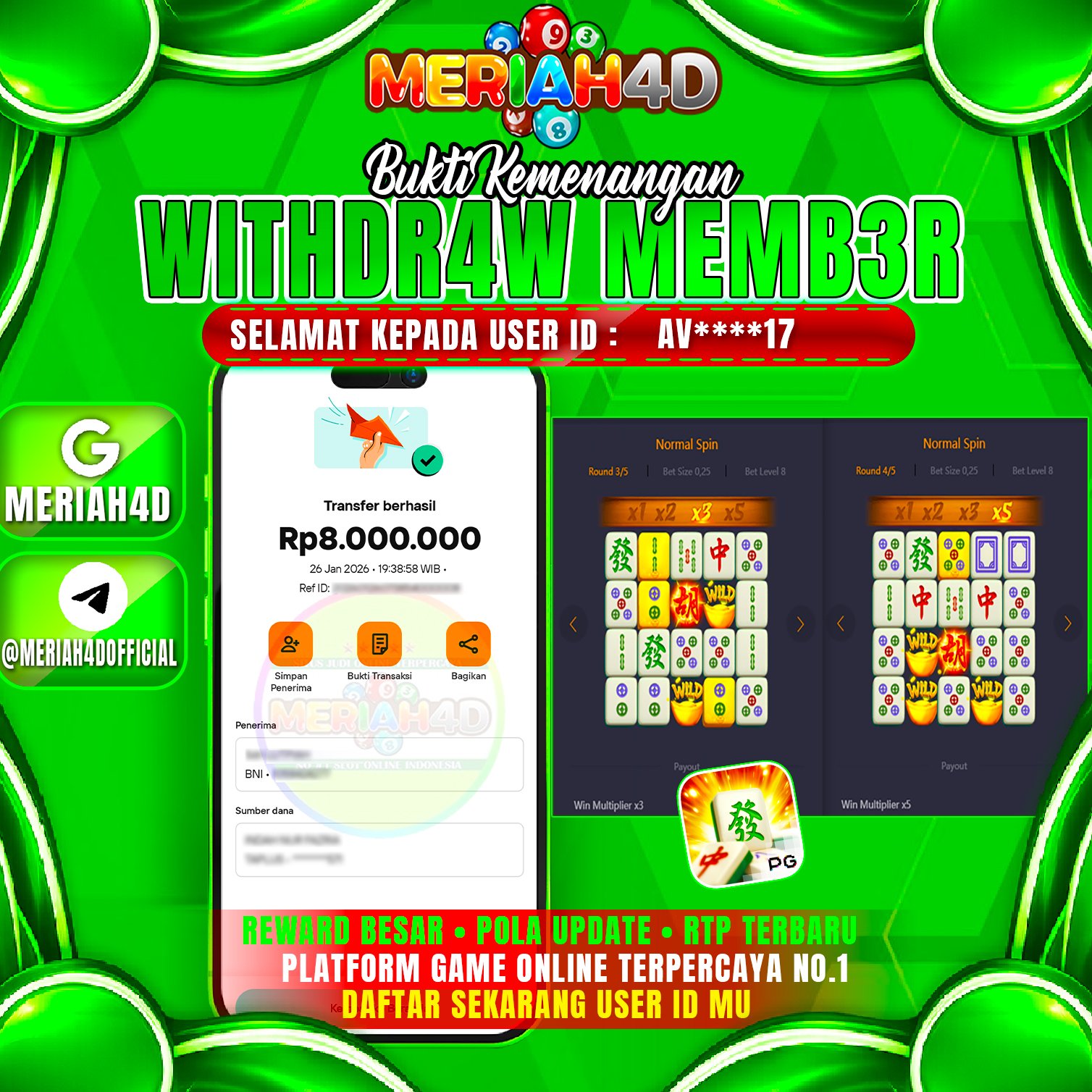 Selamat Kepada ID : AV******17 Atas Withdraw Rp. 8.000.000 Juta Hari ini. Ditunggu Withdraw Selanjutnya dan ajak juga teman temannya bergabung di Meriah4d