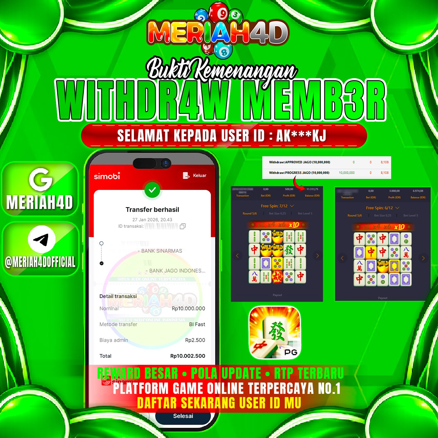 Selamat Kepada ID : AK******KJ Atas Withdraw Rp. 10.000.000 Juta Hari ini. Ditunggu Withdraw Selanjutnya dan ajak juga teman temannya bergabung di Meriah4d