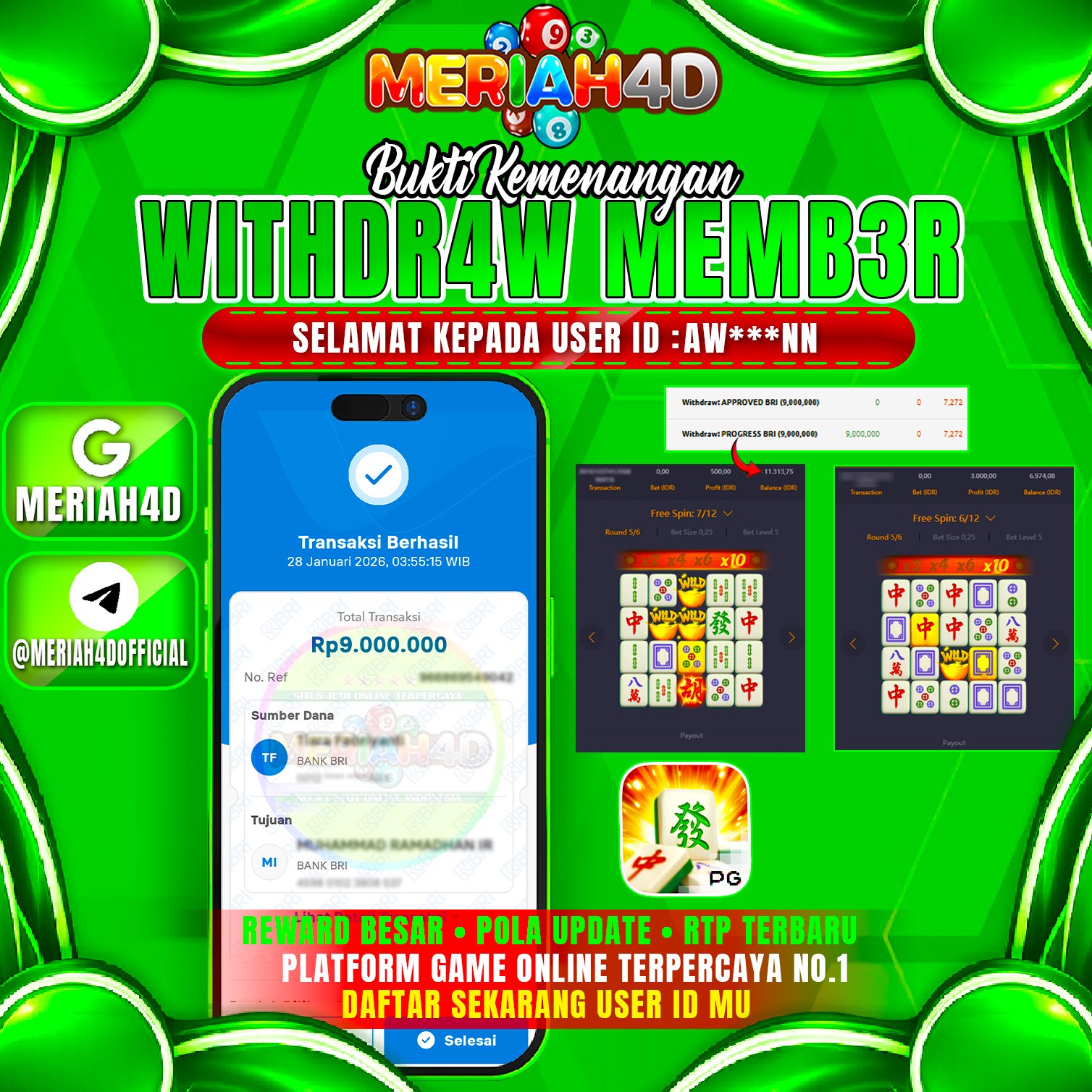 Selamat Kepada ID : AW******NN Atas Withdraw Rp. 9.000.000 Juta Hari ini. Ditunggu Withdraw Selanjutnya dan ajak juga teman temannya bergabung di Meriah4d