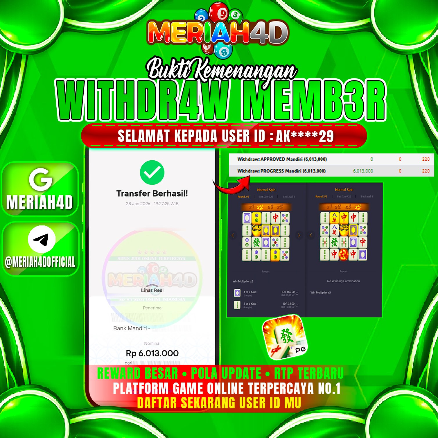 Selamat Kepada ID : AK******29 Atas Withdraw Rp. 6.013.000 Juta Hari ini. Ditunggu Withdraw Selanjutnya dan ajak juga teman temannya bergabung di Meriah4d
