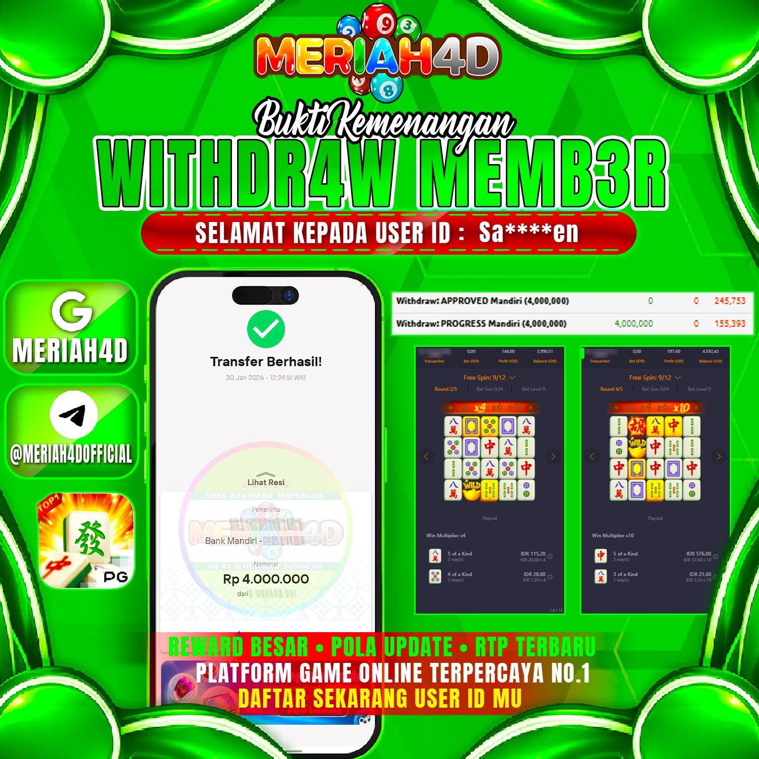 Selamat Kepada ID : SA****EN Atas Withdraw Rp. 4.000.000 Juta Hari ini. Ditunggu Withdraw Selanjutnya dan ajak juga teman temannya bergabung di Meriah4d