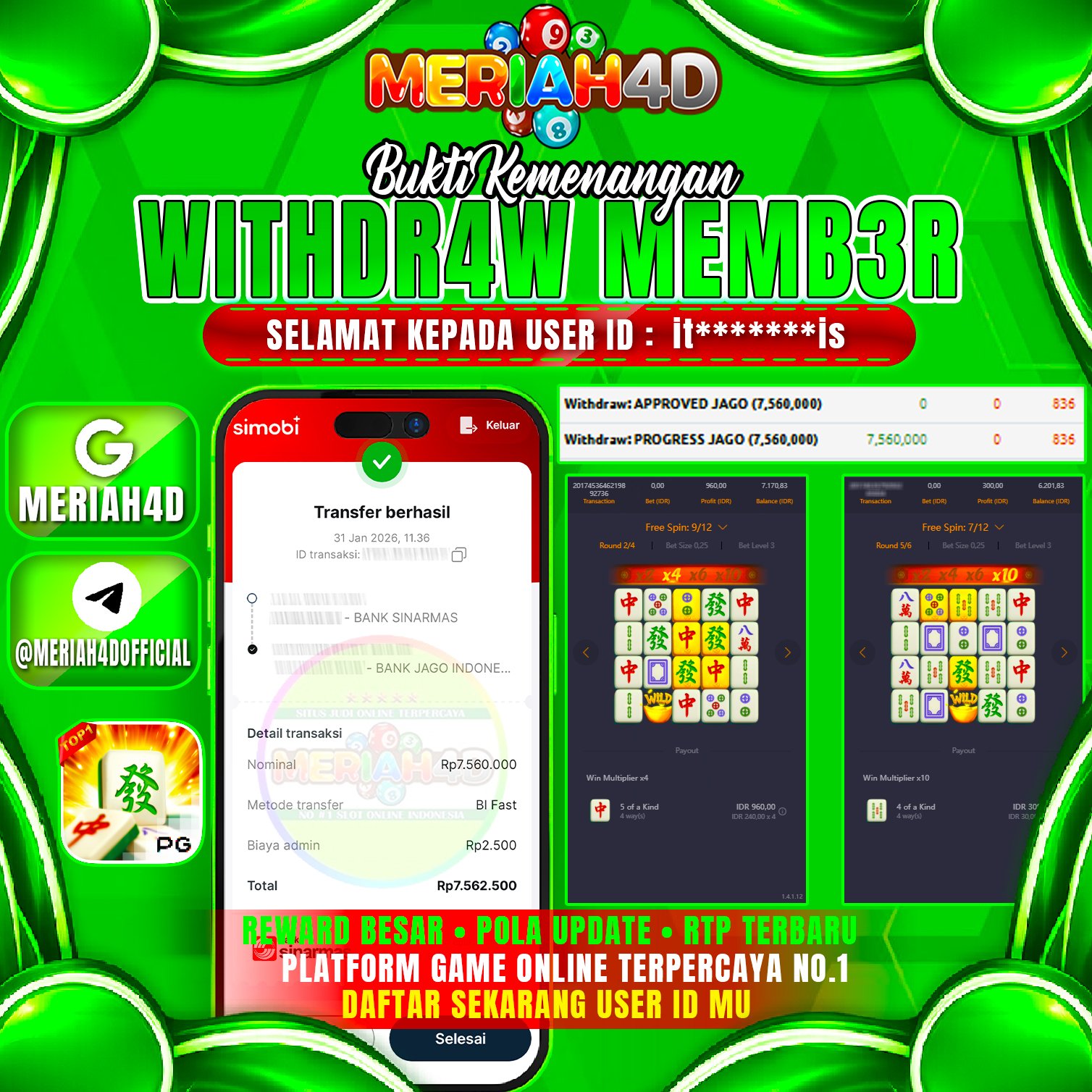 Selamat Kepada ID : IT*******IS Atas Withdraw Rp. 7.560.000 Juta Hari ini. Ditunggu Withdraw Selanjutnya dan ajak juga teman temannya bergabung di Meriah4d