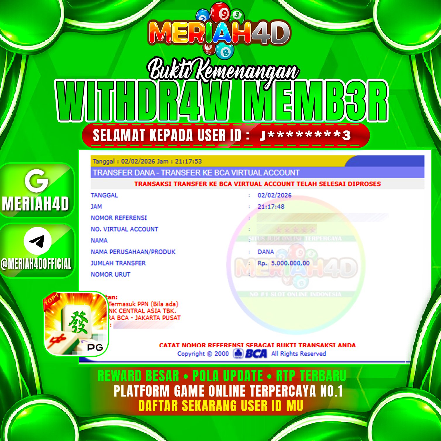 Selamat Kepada ID : J****3 Atas Withdraw Rp. 5.000.000 Juta Hari ini. Ditunggu Withdraw Selanjutnya dan ajak juga teman temannya bergabung di Meriah4d