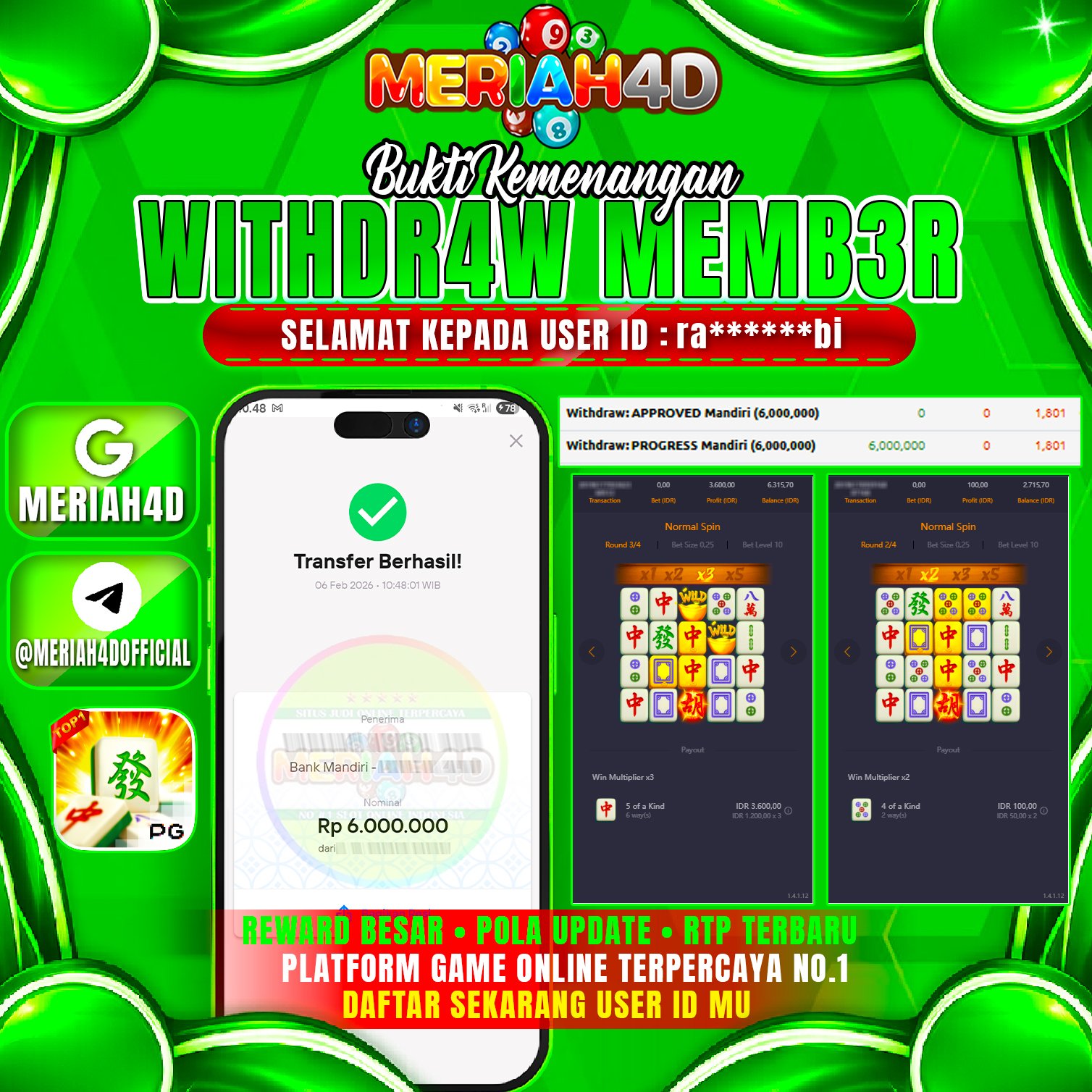 Selamat Kepada ID : RA******BI Atas Withdraw Rp. 6.000.000 Juta Hari ini. Ditunggu Withdraw Selanjutnya dan ajak juga teman temannya bergabung di Meriah4d
