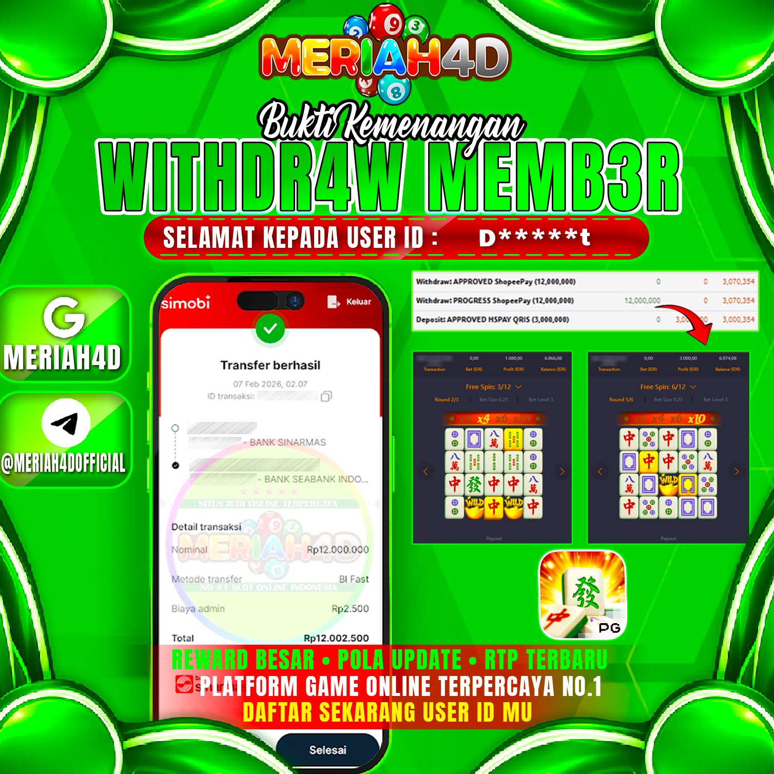 Selamat Kepada ID : D*******T Atas Withdraw Rp. 12.000.000 Juta Hari ini. Ditunggu Withdraw Selanjutnya dan ajak juga teman temannya bergabung di Meriah4d