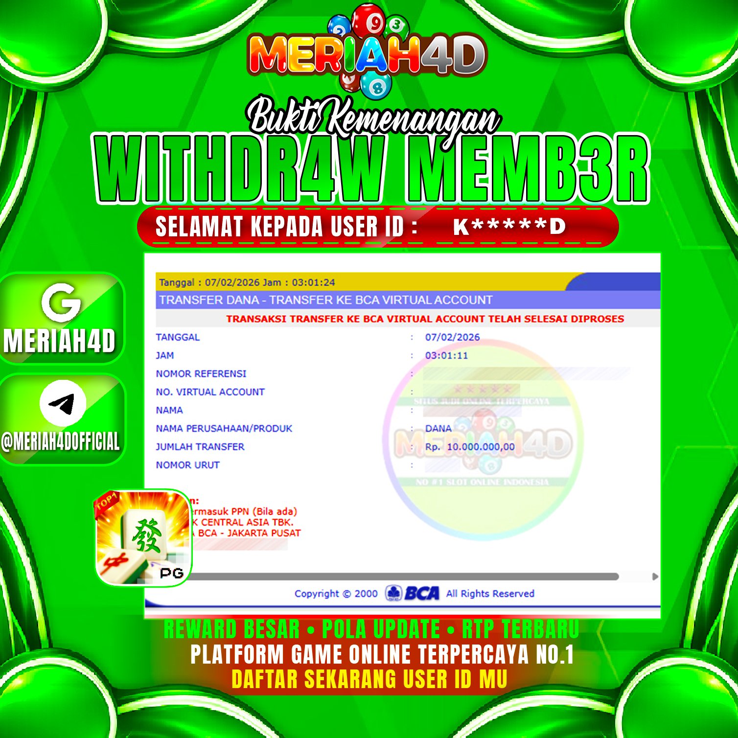 Selamat Kepada ID : K*******D Atas Withdraw Rp. 10.000.000 Juta Hari ini. Ditunggu Withdraw Selanjutnya dan ajak juga teman temannya bergabung di Meriah4d