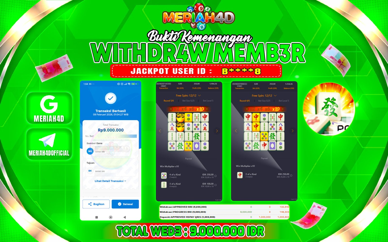 Selamat Kepada ID : B******8 Atas Withdraw Rp. 9.000.000 Juta Hari ini. Ditunggu Withdraw Selanjutnya dan ajak juga teman temannya bergabung di Meriah4d