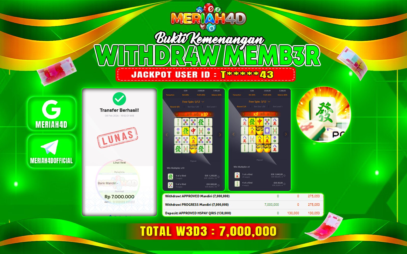Selamat Kepada ID : T******43 Atas Withdraw Rp. 7.000.000 Juta Hari ini. Ditunggu Withdraw Selanjutnya dan ajak juga teman temannya bergabung di Meriah4d