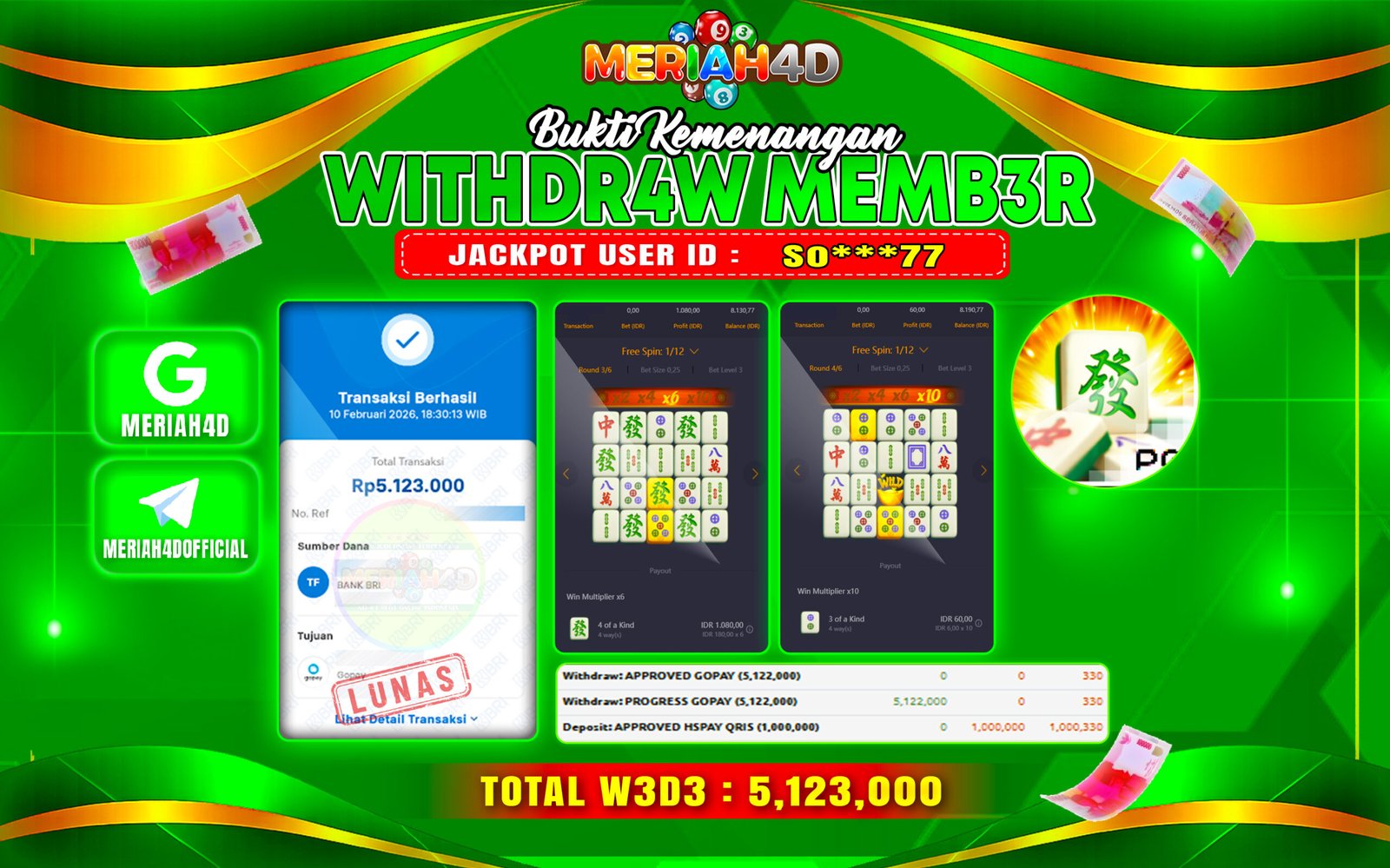 Selamat Kepada ID : SO*****77 Atas Withdraw Rp. 5.123.000 Juta Hari ini. Ditunggu Withdraw Selanjutnya dan ajak juga teman temannya bergabung di Meriah4d