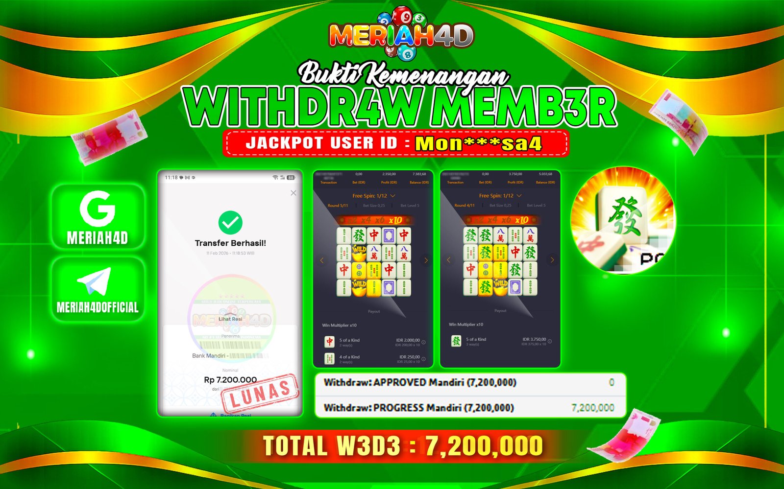 Selamat Kepada ID : MON***SA4 Atas Withdraw Rp. 12.700.000 Juta Hari ini. Ditunggu Withdraw Selanjutnya dan ajak juga teman temannya bergabung di Meriah4d