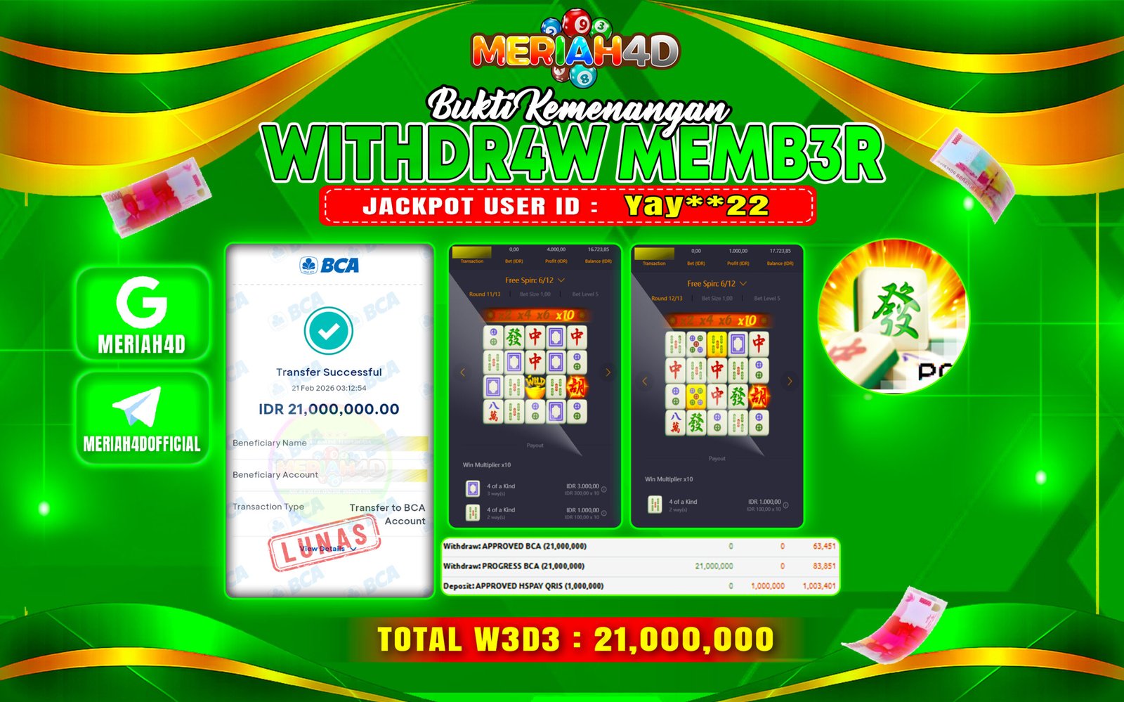 Selamat Kepada ID : YAY****22 Atas Withdraw Rp. 21.000.000 Juta Hari ini. Ditunggu Withdraw Selanjutnya dan ajak juga teman temannya bergabung di Meriah4d