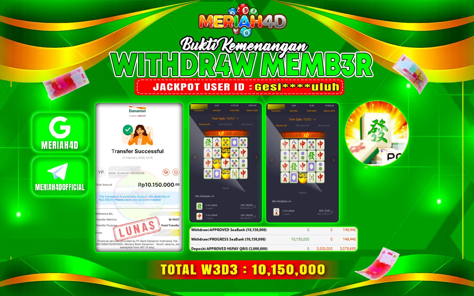 Selamat Kepada ID : GES****ULUH Atas Withdraw Rp. 10.150.000 Juta Hari ini. Ditunggu Withdraw Selanjutnya dan ajak juga teman temannya bergabung di Meriah4d