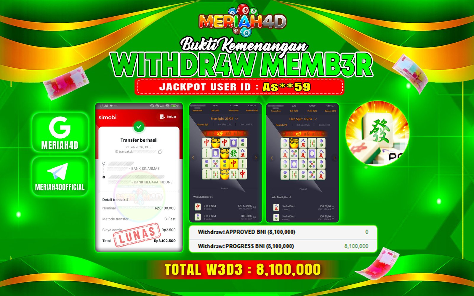 Selamat Kepada ID : AS**59 Atas Withdraw Rp. 8.100.000 Juta Hari ini. Ditunggu Withdraw Selanjutnya dan ajak juga teman temannya bergabung di Meriah4d