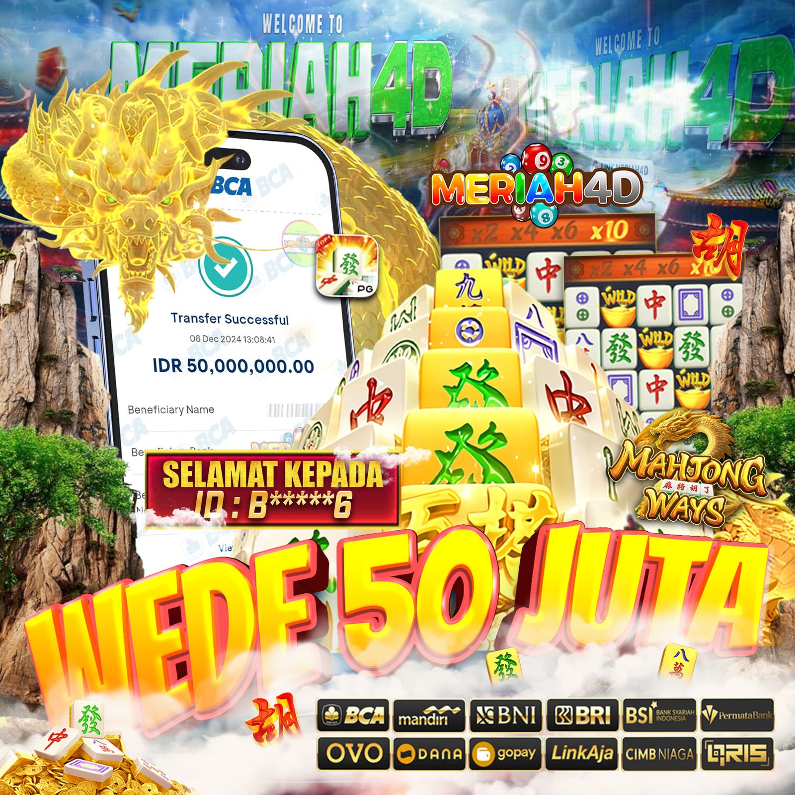 Selamat Kepada Id : B*******6 Atas Withdraw Rp. 50.000.000 Juta Hari ini. Ditunggu Withdraw Selanjutnya dan ajak juga teman temannya bergabung di Meriah4d