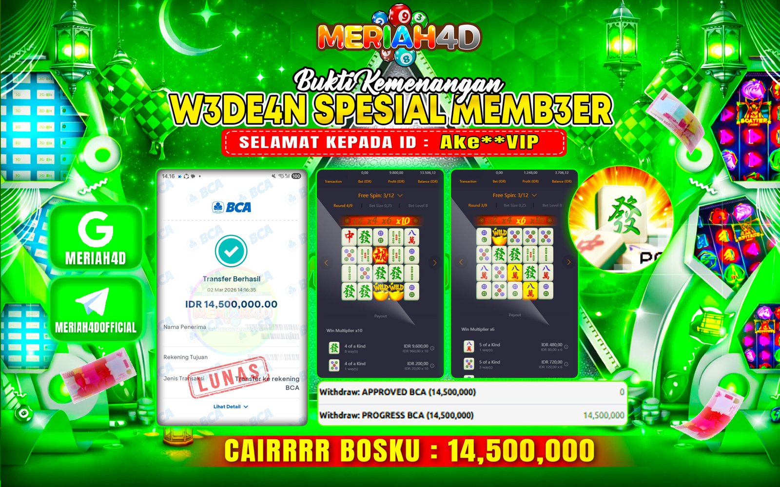 Selamat Kepada ID : AKE**VIP Atas Withdraw Rp. 14.500.000 Juta Hari ini. Ditunggu Withdraw Selanjutnya dan ajak juga teman temannya bergabung di Meriah4d