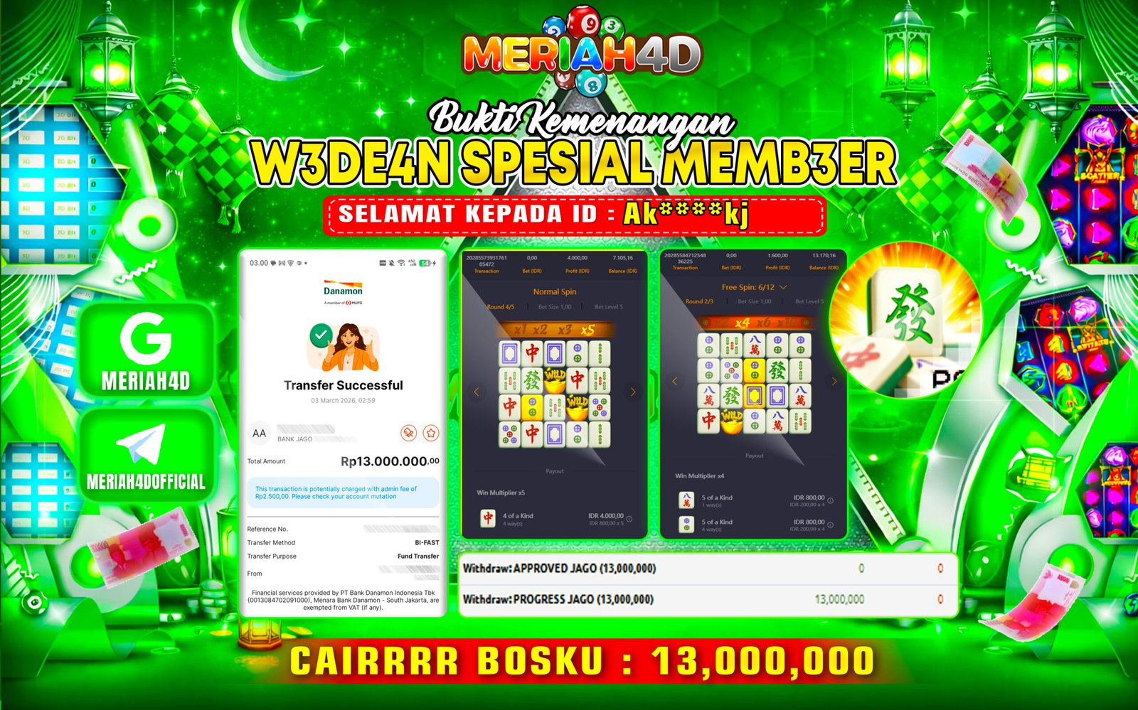 Selamat Kepada ID : AKE****KJ Atas Withdraw Rp. 13.000.000 Juta Hari ini. Ditunggu Withdraw Selanjutnya dan ajak juga teman temannya bergabung di Meriah4d