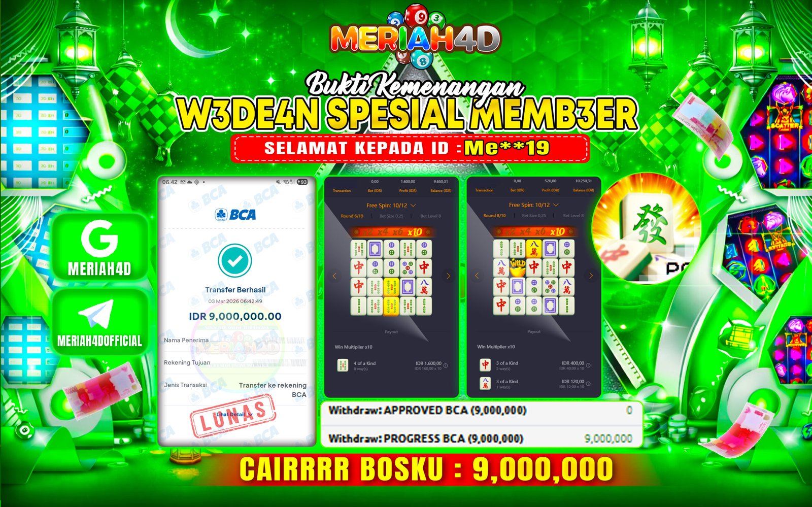 Selamat Kepada ID : ME**19 Atas Withdraw Rp. 9.000.000 Juta Hari ini. Ditunggu Withdraw Selanjutnya dan ajak juga teman temannya bergabung di Meriah4d