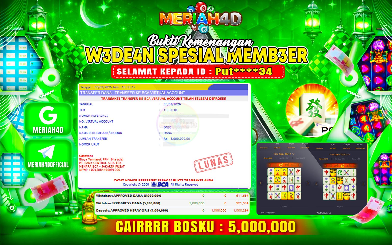 Selamat Kepada ID : PUT*****34 Atas Withdraw Rp. 5.000.000 Juta Hari ini. Ditunggu Withdraw Selanjutnya dan ajak juga teman temannya bergabung di Meriah4d