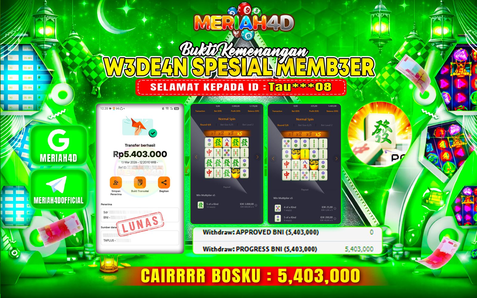 Selamat Kepada ID : Tau***08 Atas Withdraw Rp. 5.403.000 Juta Hari ini. Ditunggu Withdraw Selanjutnya dan ajak juga teman temannya bergabung di Meriah4d