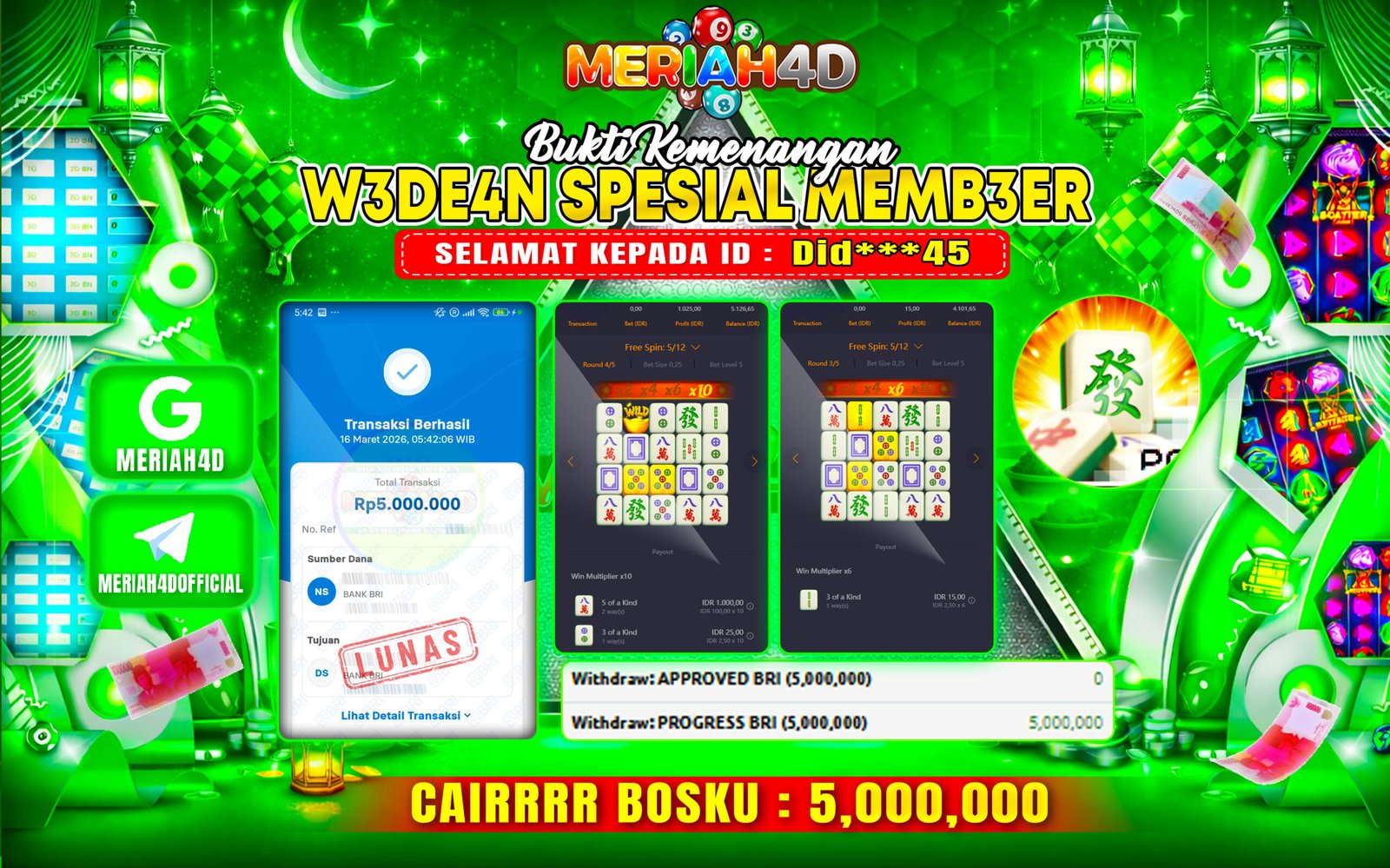 Selamat Kepada ID : Did***45 Atas Withdraw Rp.5.000.000 Juta Hari ini. Ditunggu Withdraw Selanjutnya dan ajak juga teman temannya bergabung di Meriah4d