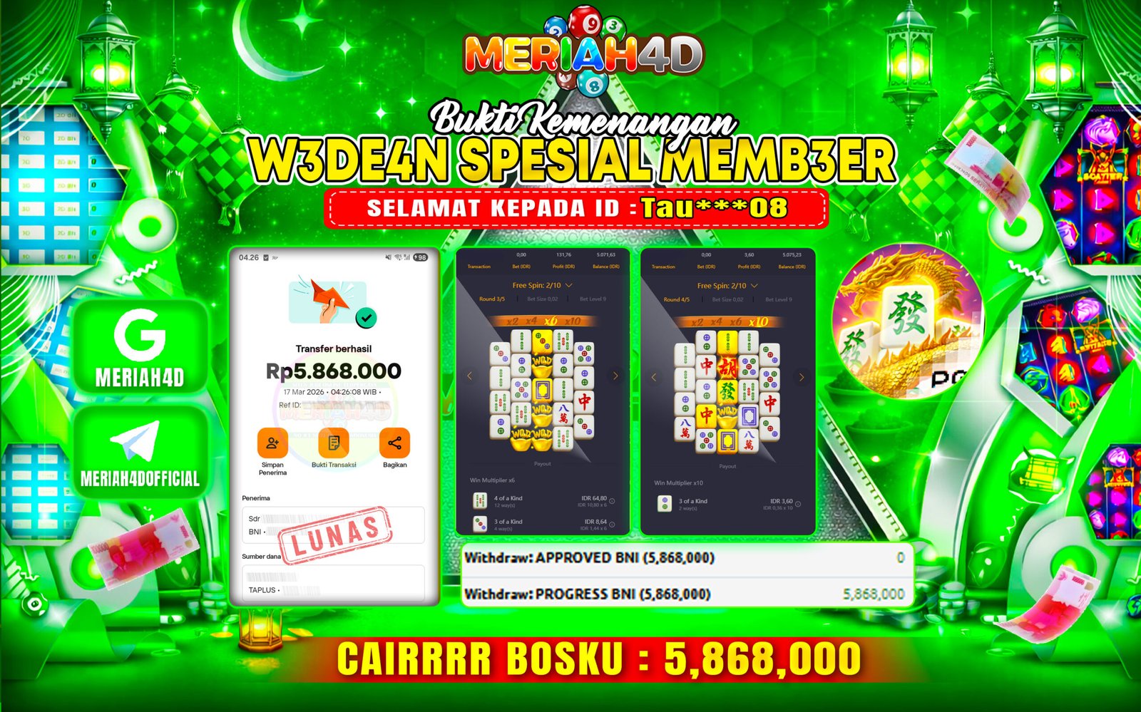 Selamat Kepada ID : Tau***08 Atas Withdraw Rp.5.868.000 Juta Hari ini. Ditunggu Withdraw Selanjutnya dan ajak juga teman temannya bergabung di Meriah4d