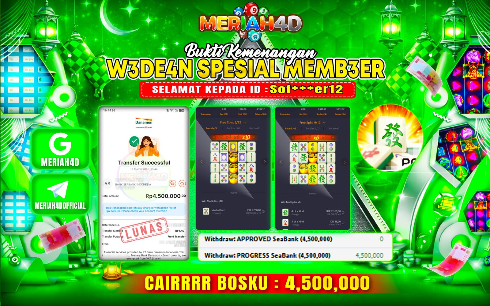 Selamat Kepada ID : Sof***er12 Atas Withdraw Rp.4.500.000 Juta Hari ini. Ditunggu Withdraw Selanjutnya dan ajak juga teman temannya bergabung di Meriah4d
