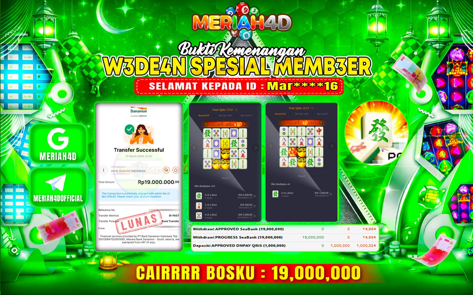Selamat Kepada ID : MAR**16 Atas Withdraw Rp. 19.000.000 Juta Hari ini. Ditunggu Withdraw Selanjutnya dan ajak juga teman temannya bergabung di Meriah4d