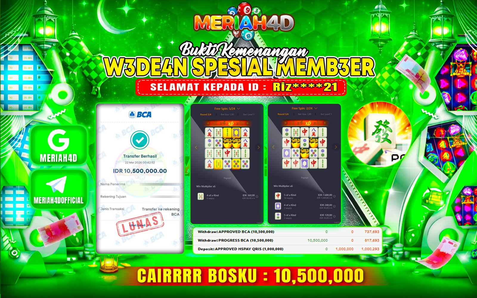 Selamat Kepada ID : RIZ****21 Atas Withdraw Rp. 10.500.000 Juta Hari ini. Ditunggu Withdraw Selanjutnya dan ajak juga teman temannya bergabung di Meriah4d