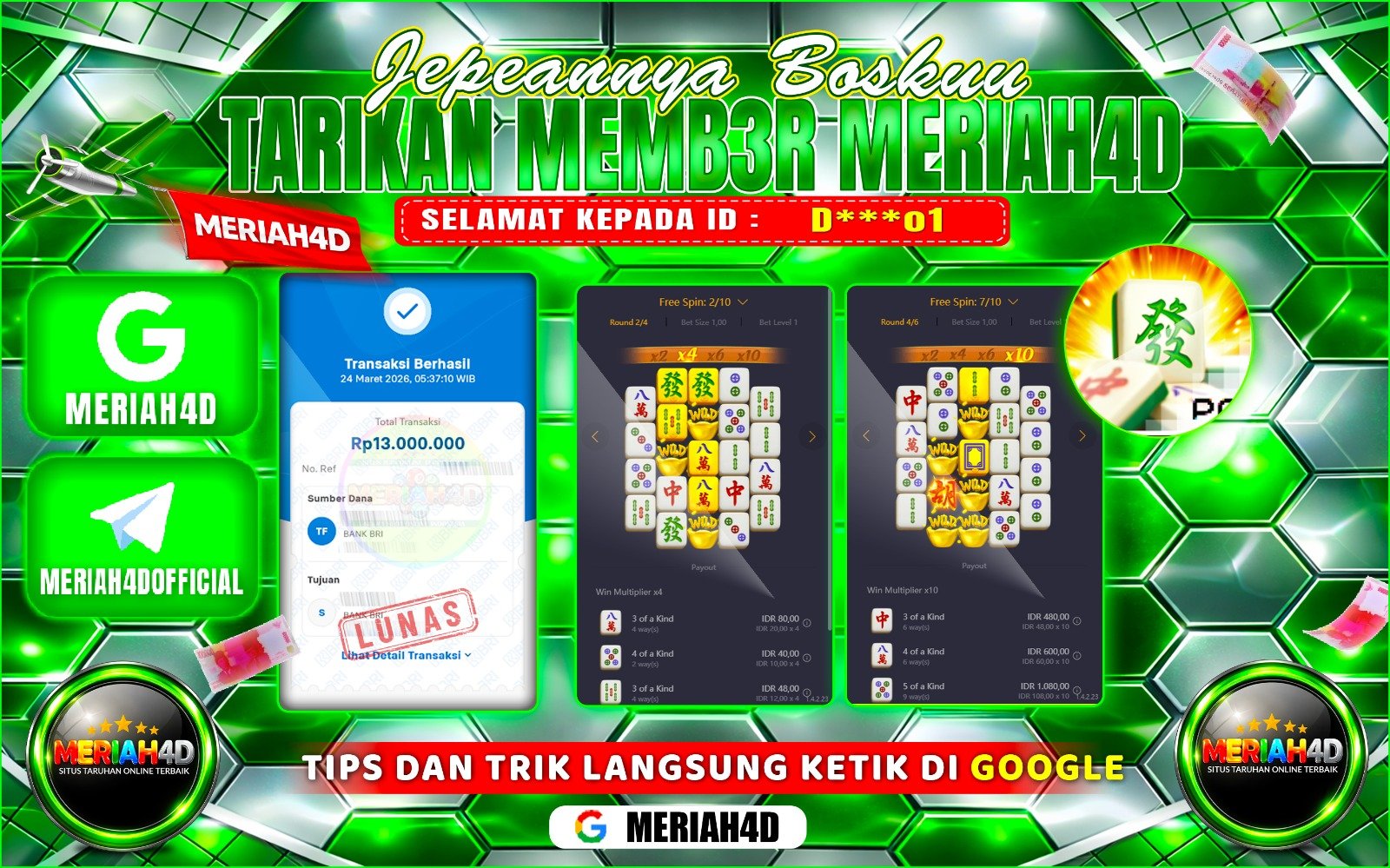 Selamat Kepada ID : D***01 Atas Withdraw Rp. 13.000.000 Juta Hari ini. Ditunggu Withdraw Selanjutnya dan ajak juga teman temannya bergabung di Meriah4d