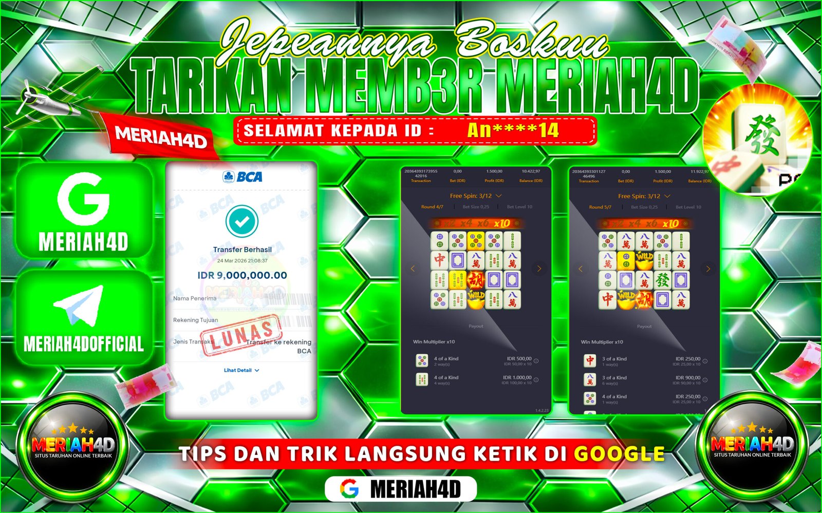 Selamat Kepada ID : AN***14 Atas Withdraw Rp. 9.000.000 Juta Hari ini. Ditunggu Withdraw Selanjutnya dan ajak juga teman temannya bergabung di Meriah4d