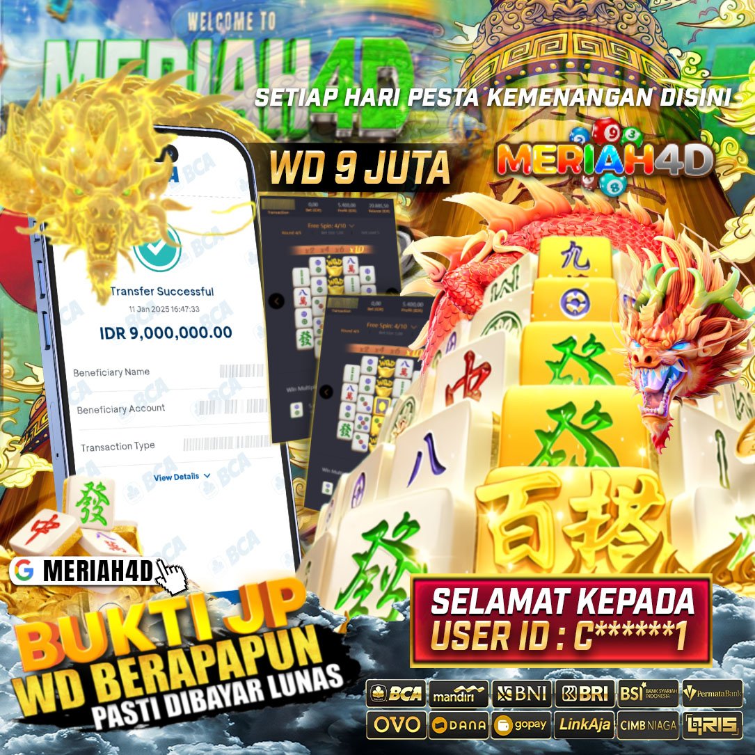 Selamat Kepada ID : C******1 Atas Withdraw Rp. 9.000.000 Juta Hari ini. Ditunggu Withdraw Selanjutnya dan ajak juga teman temannya bergabung di Meriah4d