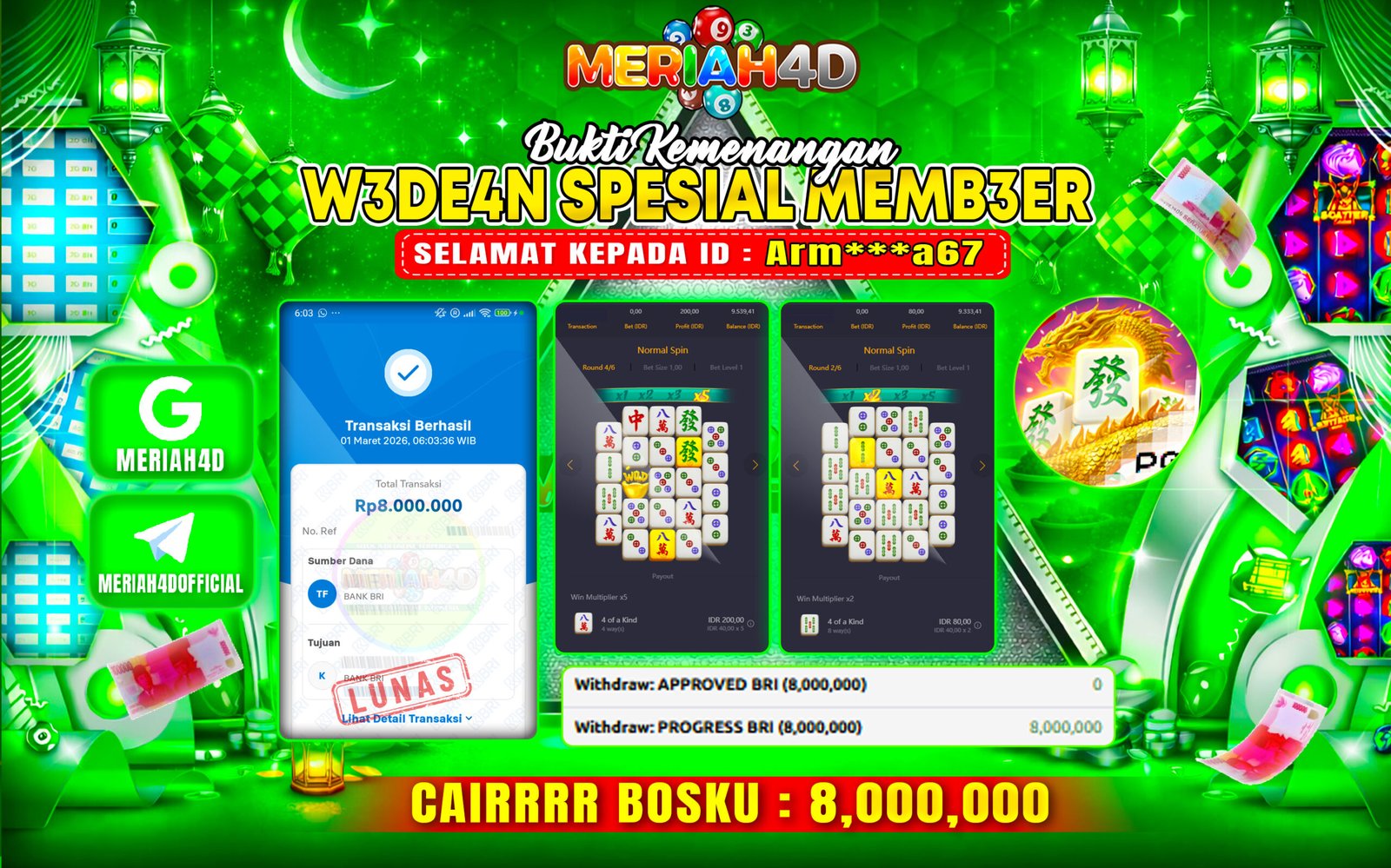 Selamat Kepada ID : ARM***A67 Atas Withdraw Rp. 8.000.000 Juta Hari ini. Ditunggu Withdraw Selanjutnya dan ajak juga teman temannya bergabung di Meriah4d