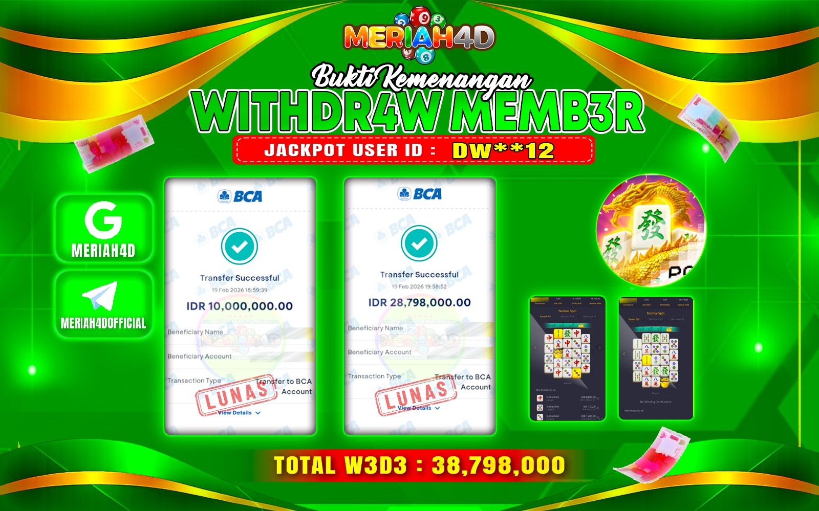 Selamat Kepada ID : DW**12 Atas Withdraw Rp. 38.798.000 Juta Hari ini. Ditunggu Withdraw Selanjutnya dan ajak juga teman temannya bergabung di Meriah4d