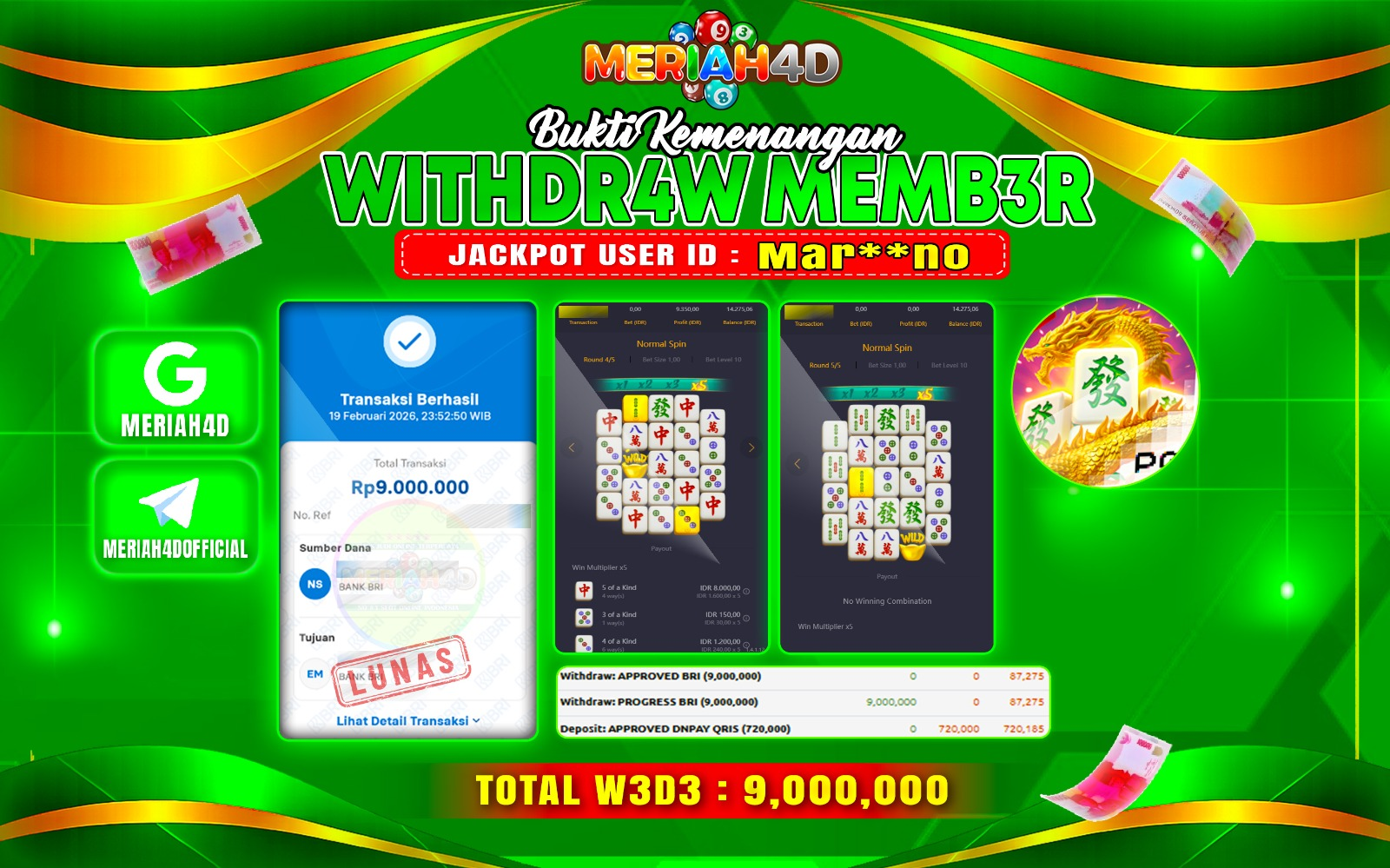 Selamat Kepada ID : MAR**NO Atas Withdraw Rp. 9.000.000 Juta Hari ini. Ditunggu Withdraw Selanjutnya dan ajak juga teman temannya bergabung di Meriah4d