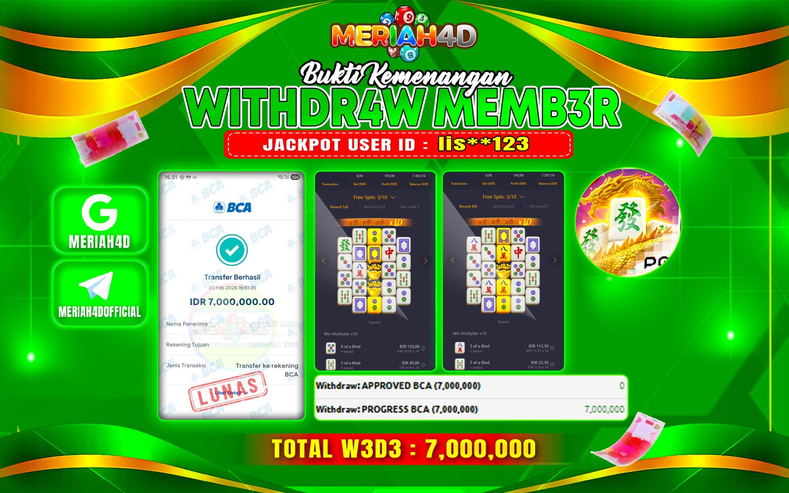 Selamat Kepada ID : LIS**123 Atas Withdraw Rp. 7.000.000 Juta Hari ini. Ditunggu Withdraw Selanjutnya dan ajak juga teman temannya bergabung di Meriah4d